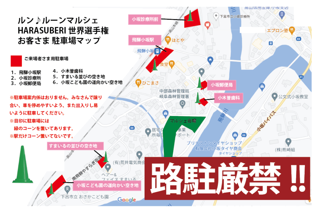 ※警察より、路上駐車厳禁の指導を受けております。今後の開催にも関わるので、絶対に路駐はNGですよ~!